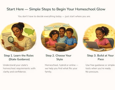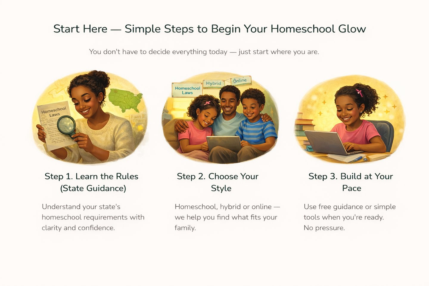 Homeschool Glow provides general educational guidance and organizational tools. Families are responsible for confirming requirements with their state.
