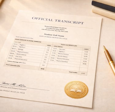 A transcript is the official academic record of your child's high school education. It documents every course your student completed, the grade they earned in each course, the credit hours assigned to each course, and their cumulative GPA. For a traditionally schooled student the school district generates this document automatically. For a homeschool student you generate it yourself.