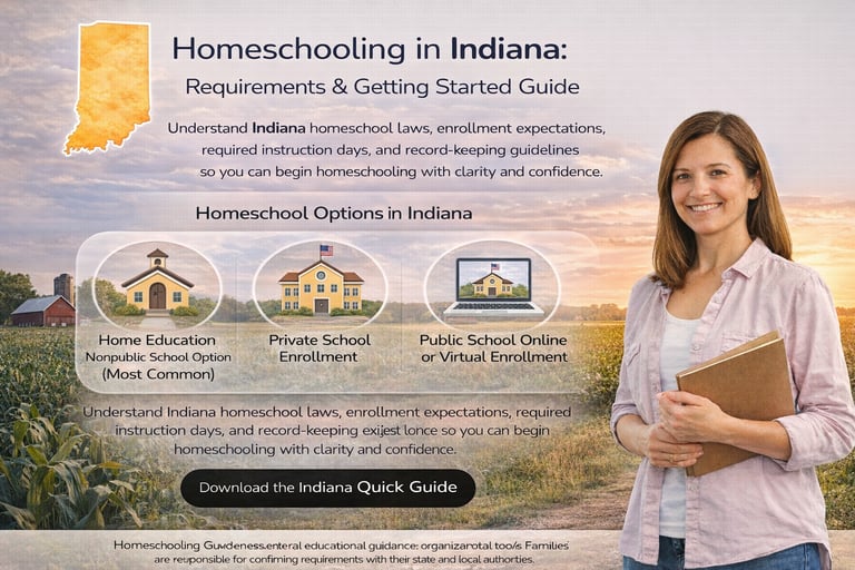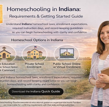 Understand Indiana homeschool laws, enrollment expectations, required instruction days, and record-keeping guidelines so you can begin homeschooling with clarity and confidence.