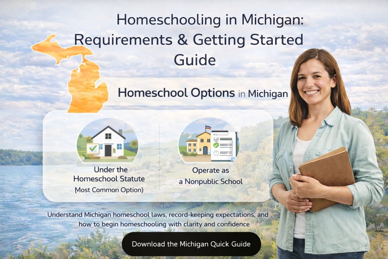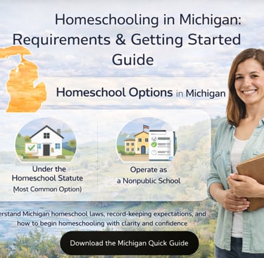 Understand Michigan homeschool laws, reporting options, subject requirements, and record-keeping expectations so you can begin homeschooling with clarity and confidence.