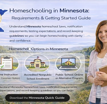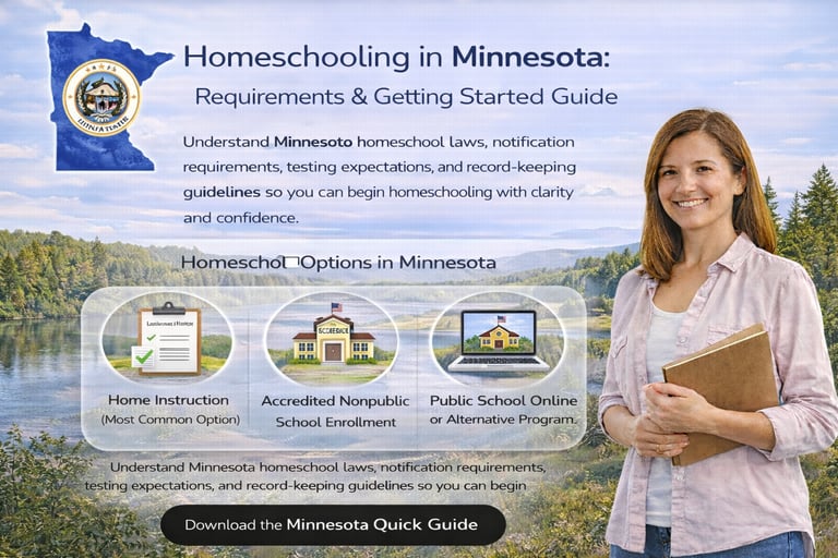 Understand Minnesota homeschool laws, notification requirements, testing expectations, and record-keeping guidelines so you can begin homeschooling with clarity and confidence.