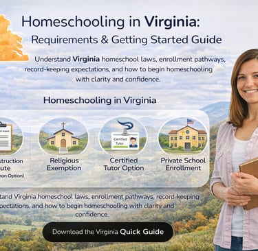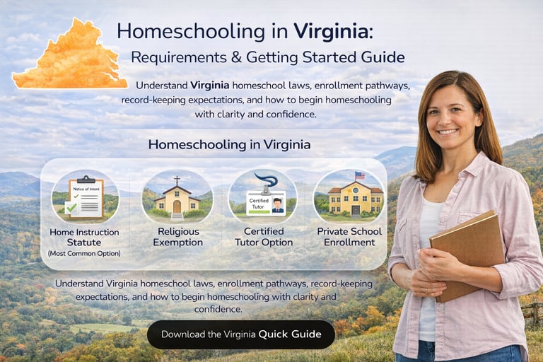 Understand Virginia homeschool laws, enrollment pathways, record-keeping expectations, and how to begin homeschooling with clarity and confidence.